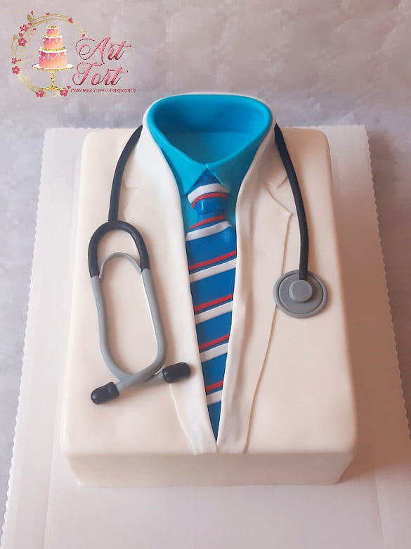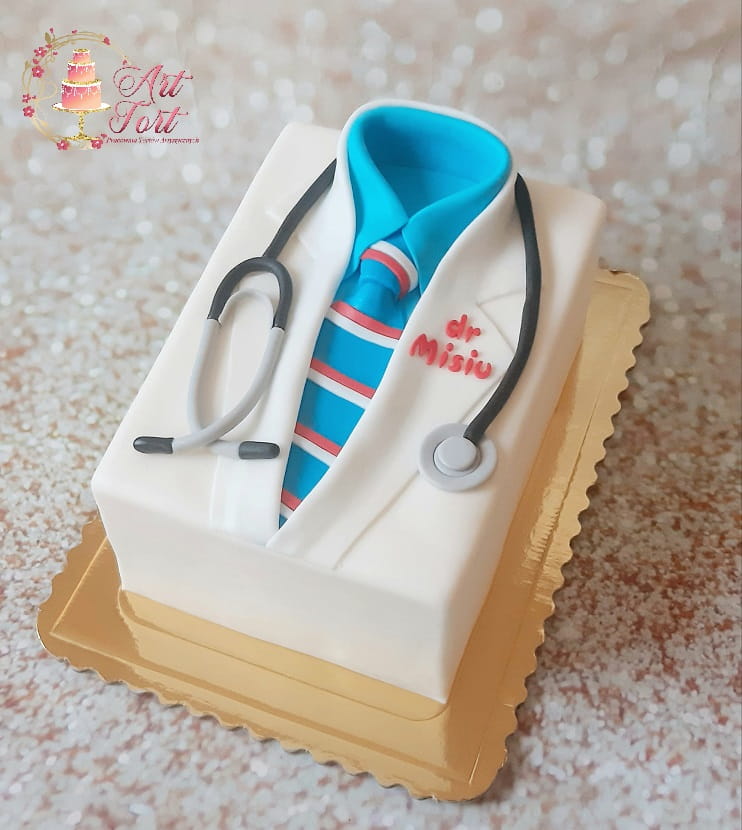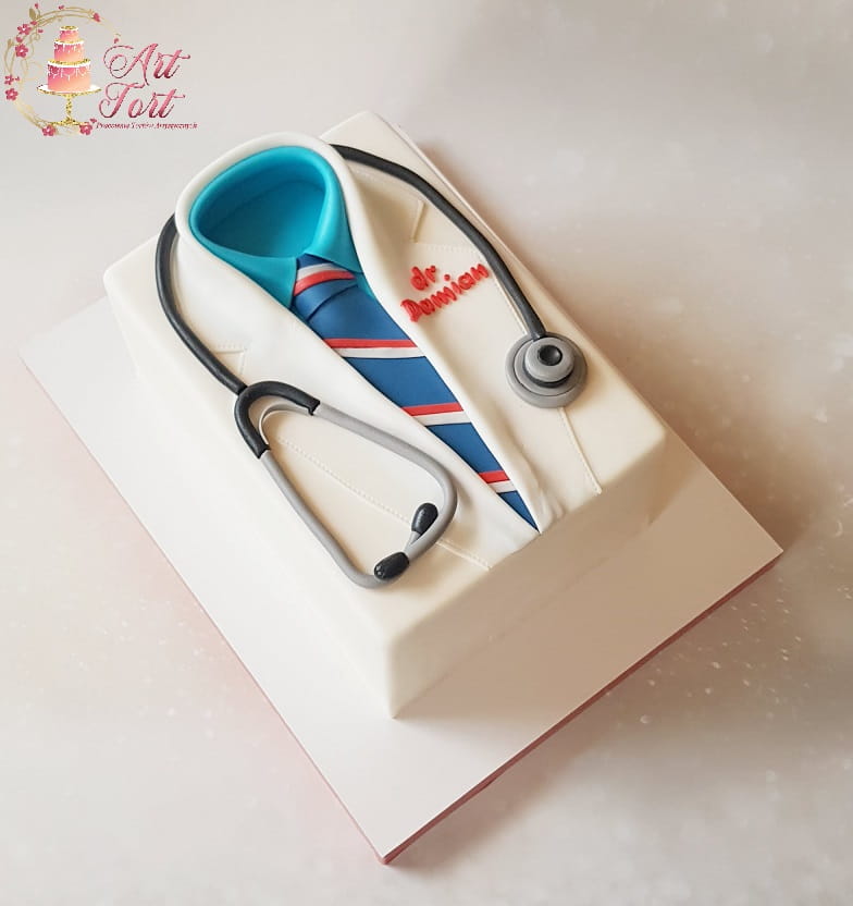 Tort w kształcie stroju lekarskiego. Wykończony masą cukrową.
