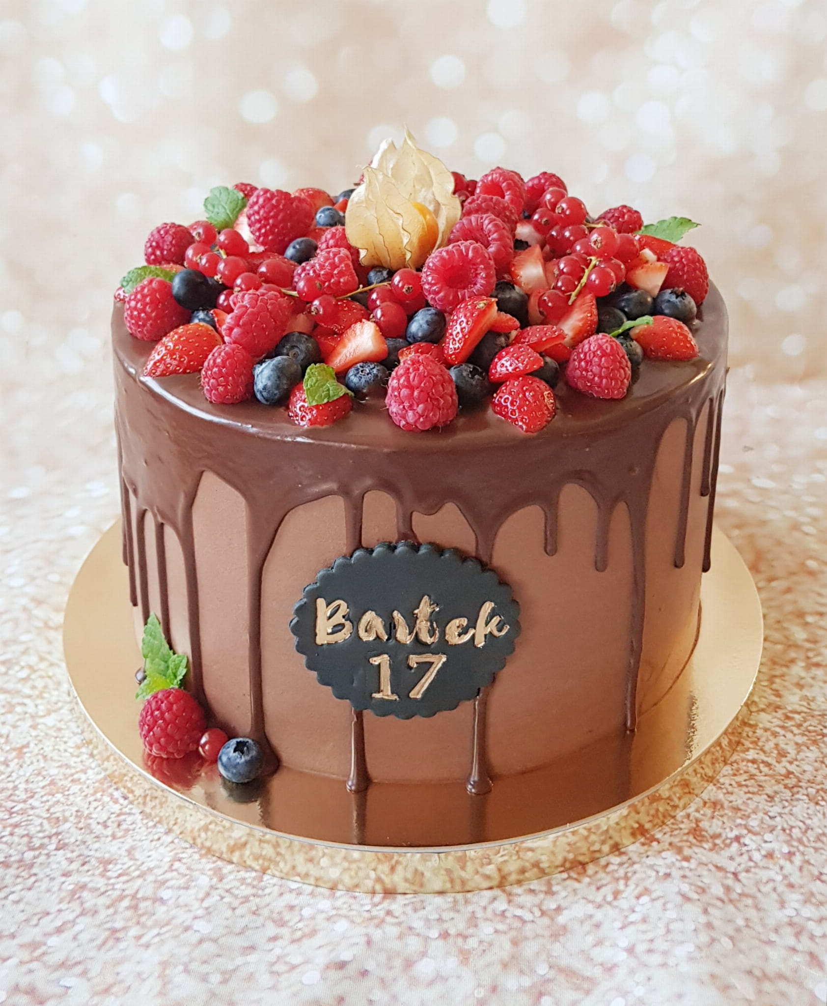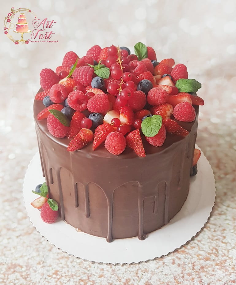 Tort czekoladowy oblany czekoladą z owocami- aktualnie dostępnymi. Od 30 porcji wykonywany w dwóch piętrach.