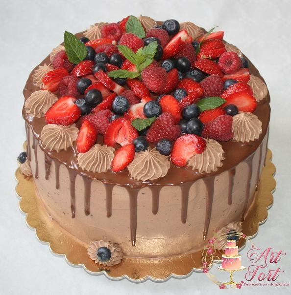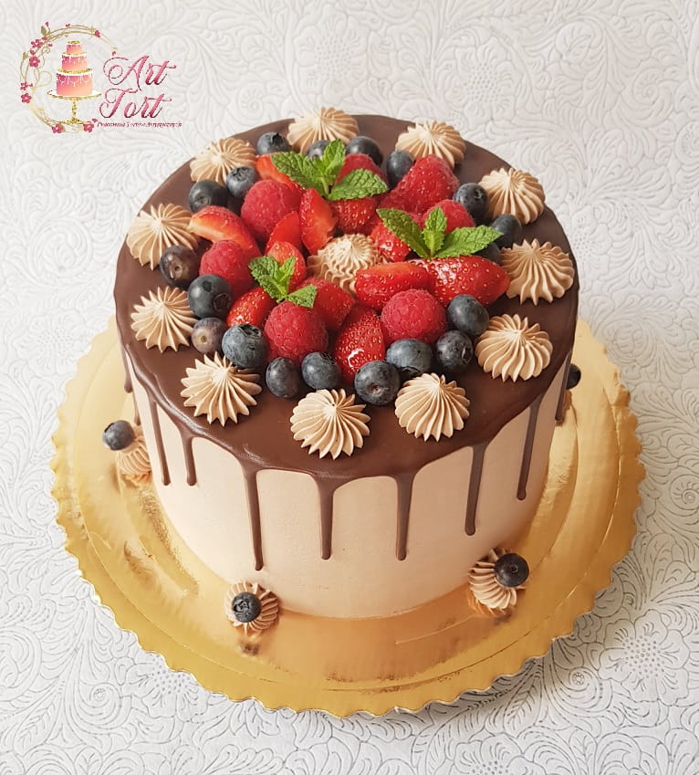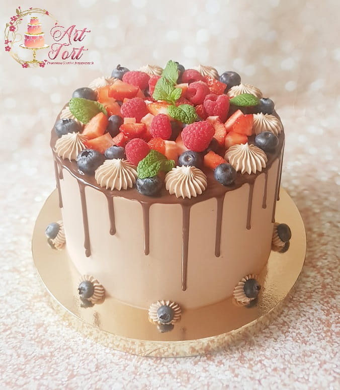 Tort drip cake czyli ozdobiony spływającą czekoladą, kremem czekoladowym oraz owocami:truskawki, borówki lub aktualnie dostępnymi.