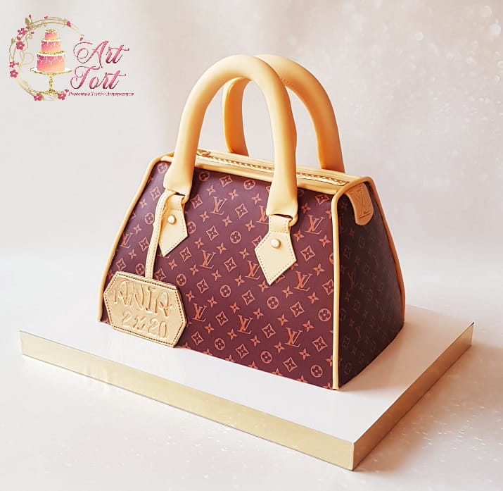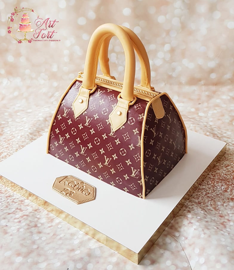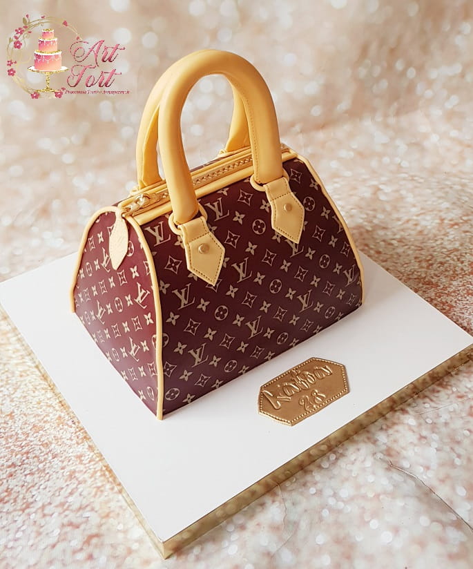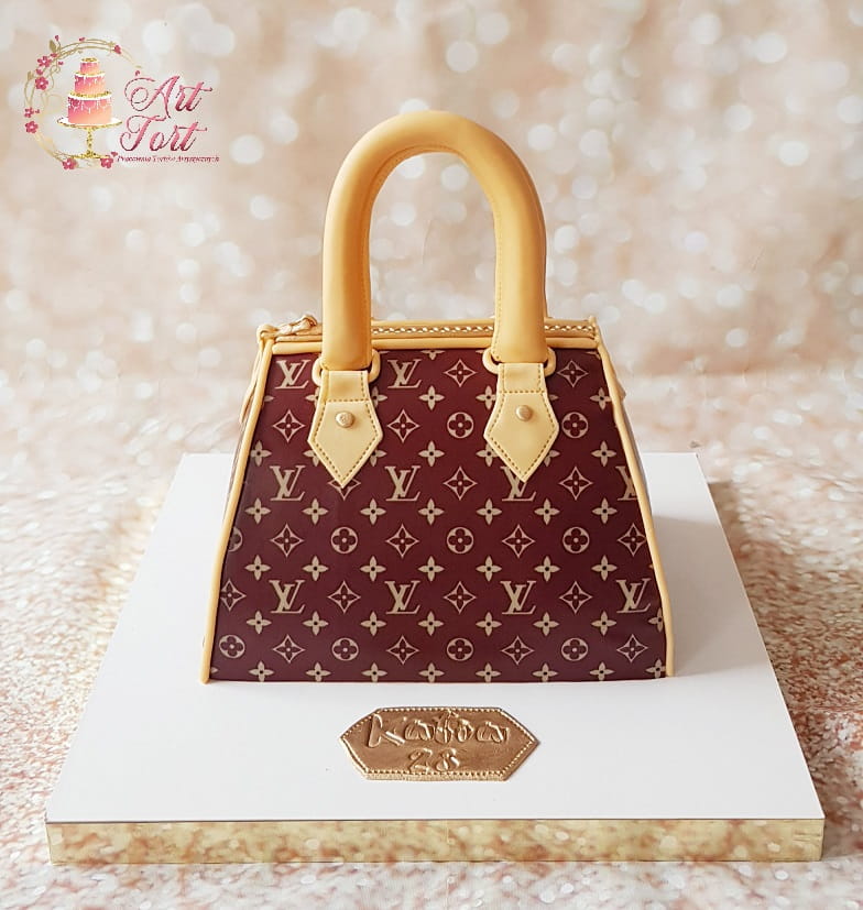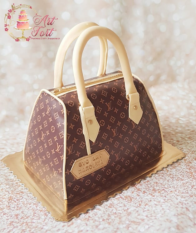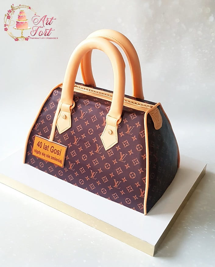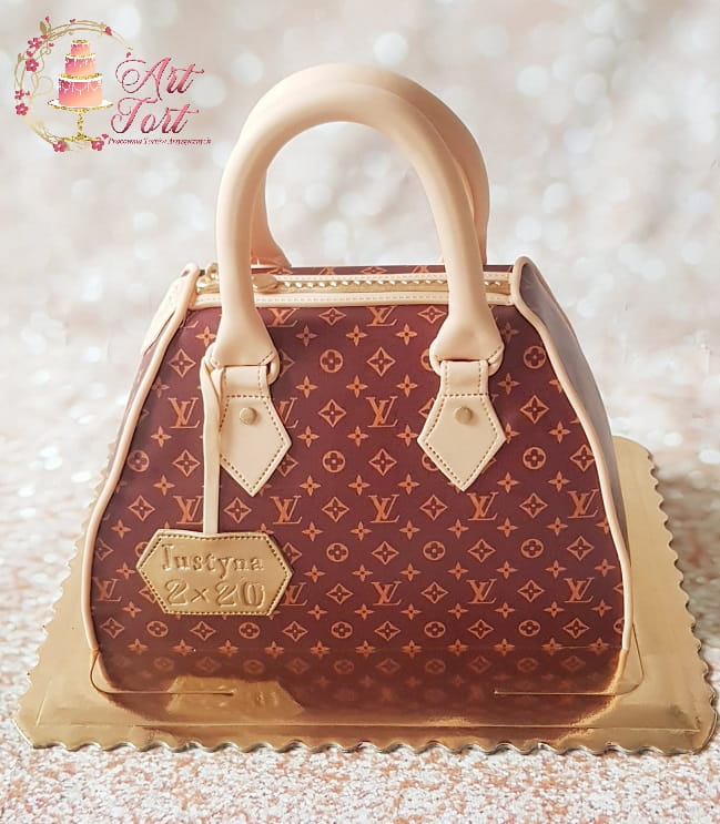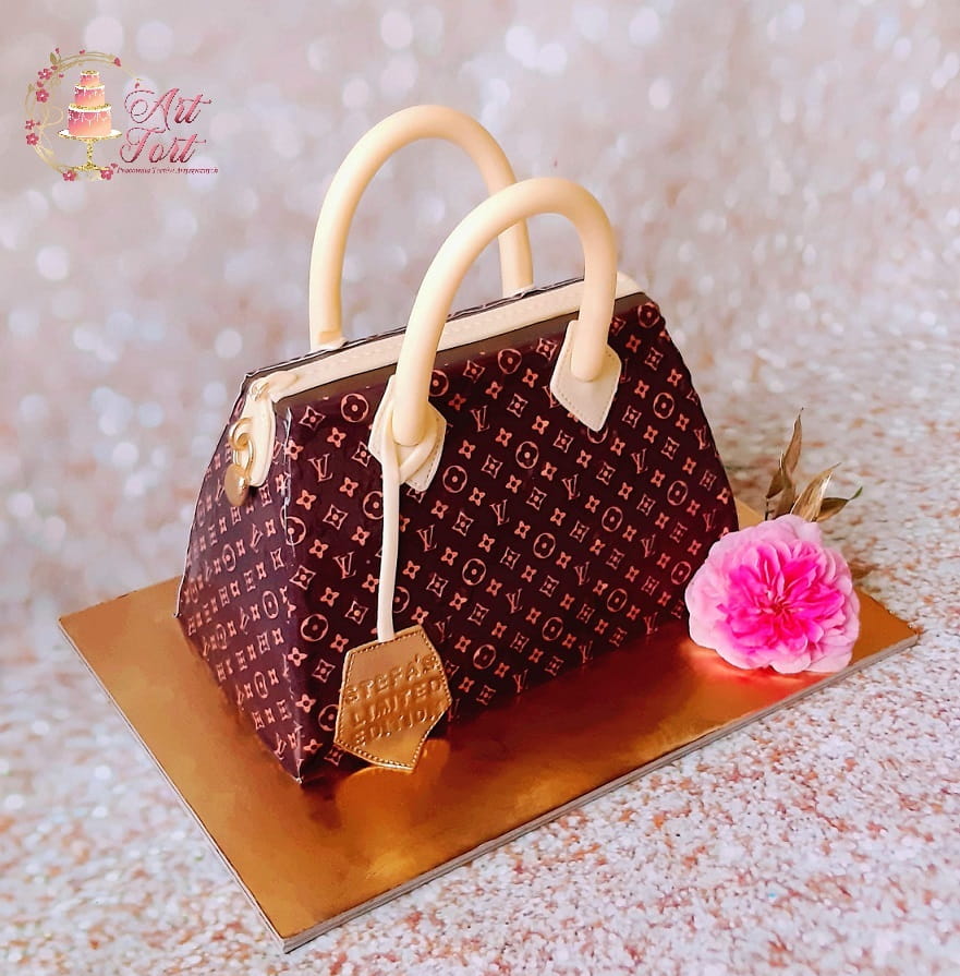 Tort w kształcie torebki. Ozdobiony nadrukiem na papierze cukrowym.
