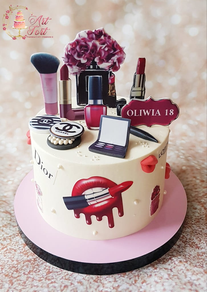 - Modny motyw: Jadalne grafiki nawiązujące do znanych marek kosmetycznych tworzą luksusowy i nowoczesny charakter wypieku.