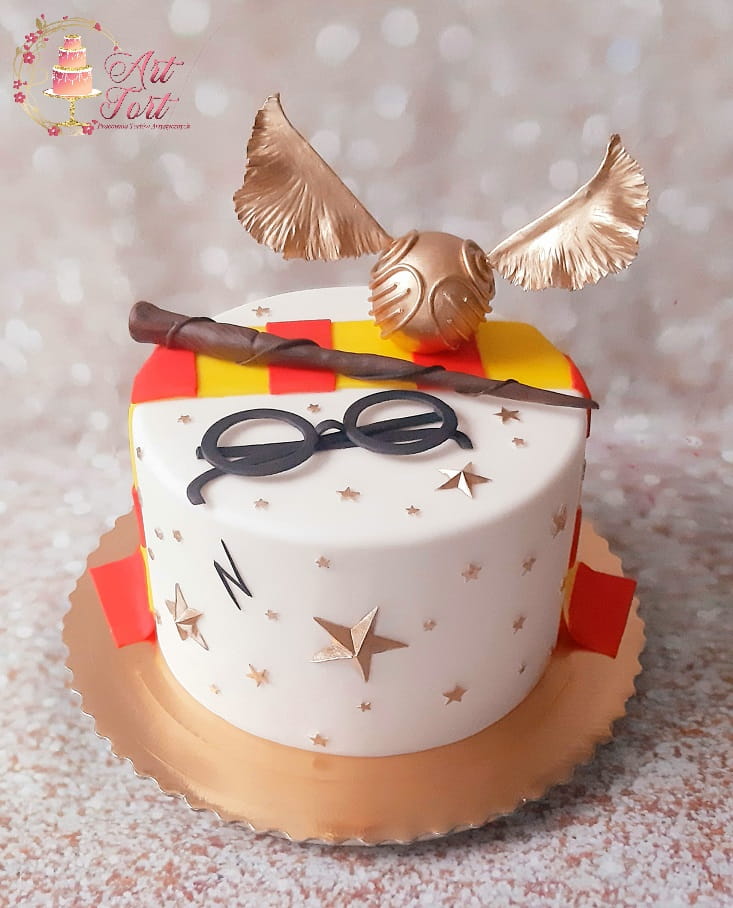 Tort z atrybutami Harrego Pottera, wykonany z masy cukrowej. Kula-znicz może mieć wypełnienie niejadalne dlatego proszę traktować tylko jako dekorację. Tort może być wykończony również w kremie bez masy cukrowej-proszę wpisać w uwagach.