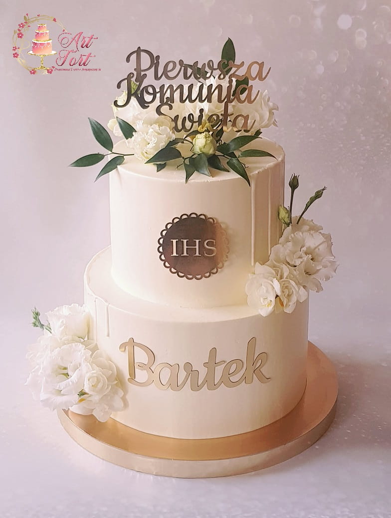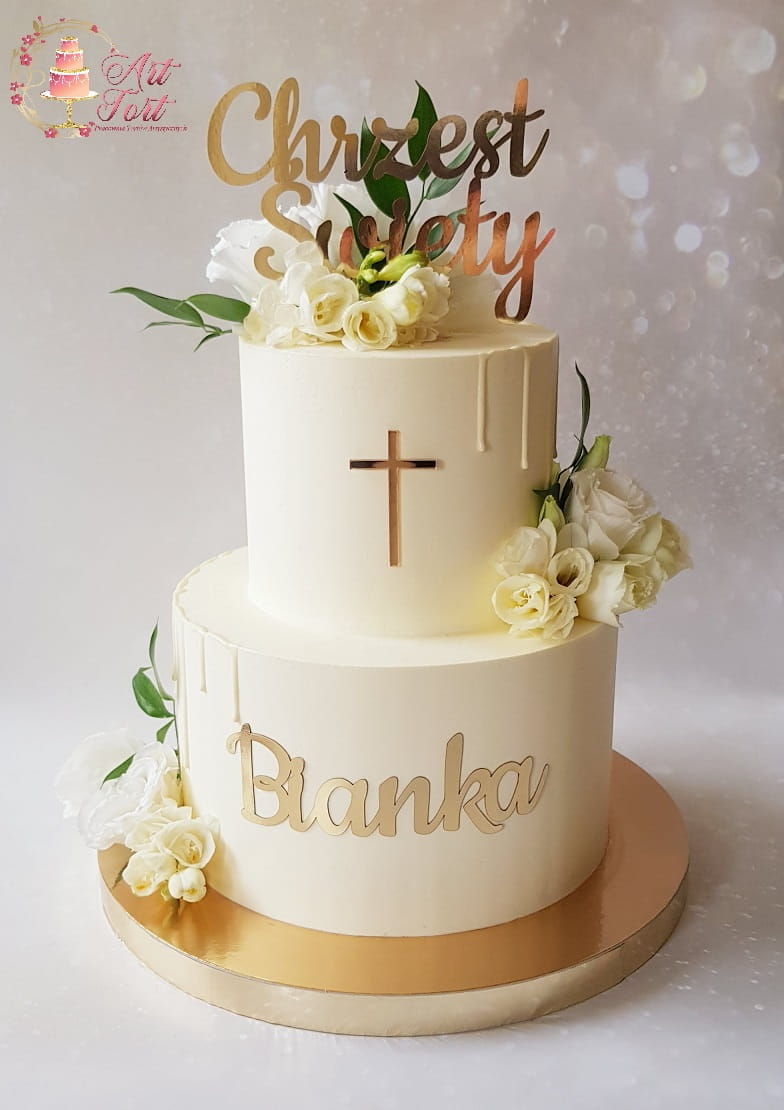Piętrowy tort okolicznościowy z białymi kwiatami, mogą to być frezje, eustomy, róże w zależności od dostępności lub wcześniejszego ustalenia. Idealny na komunię, chrzciny, urodziny i inne okazje. Tort wykończony jest kremem maślanym. Złote napisy, toppery i inne możliwe przy zamówieniu/zadatkowaniu, z wyprzedzeniem minimum 10 dni, lub do ustalenia. Napisy mogą też zostać wykonane standardowo z liter z masy cukrowej. Proszę podać imię i z jakiej okazji ma być tort.