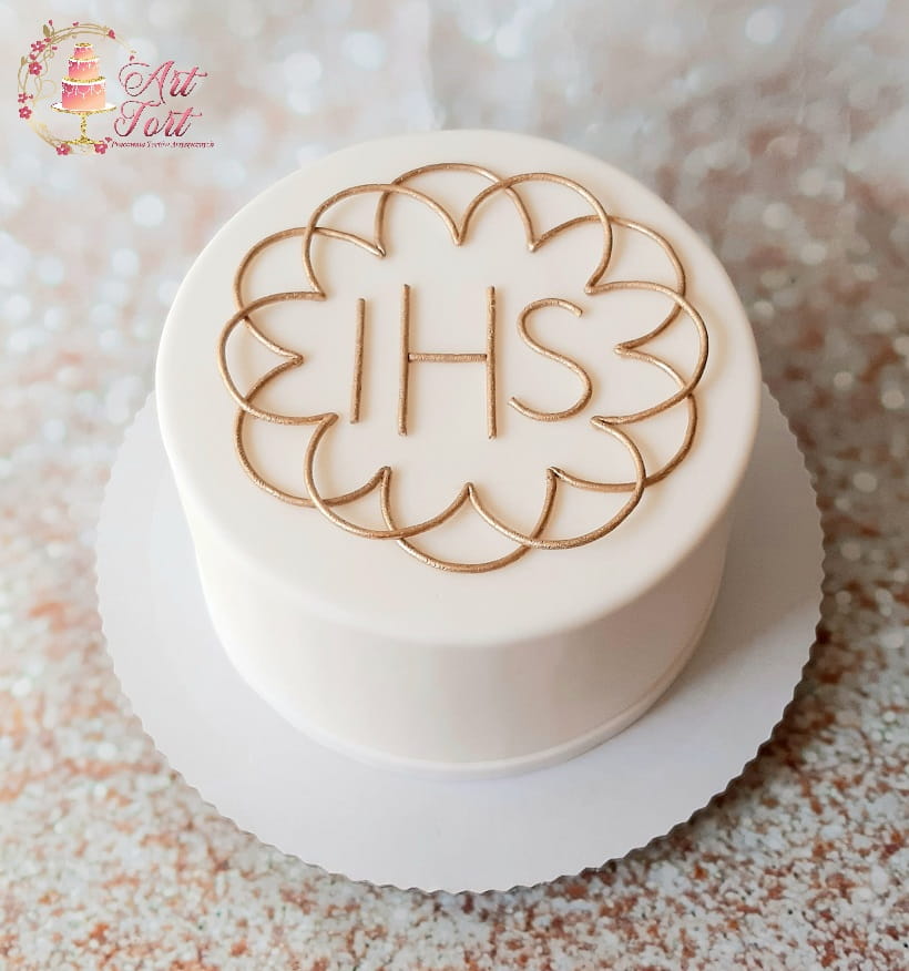 Tort komunijny pokryty masą cukrową, dekoracje z masy cukrowej malowane na złoto. Powyżej 30 porcji tort wykonywany w dwóch piętrach.