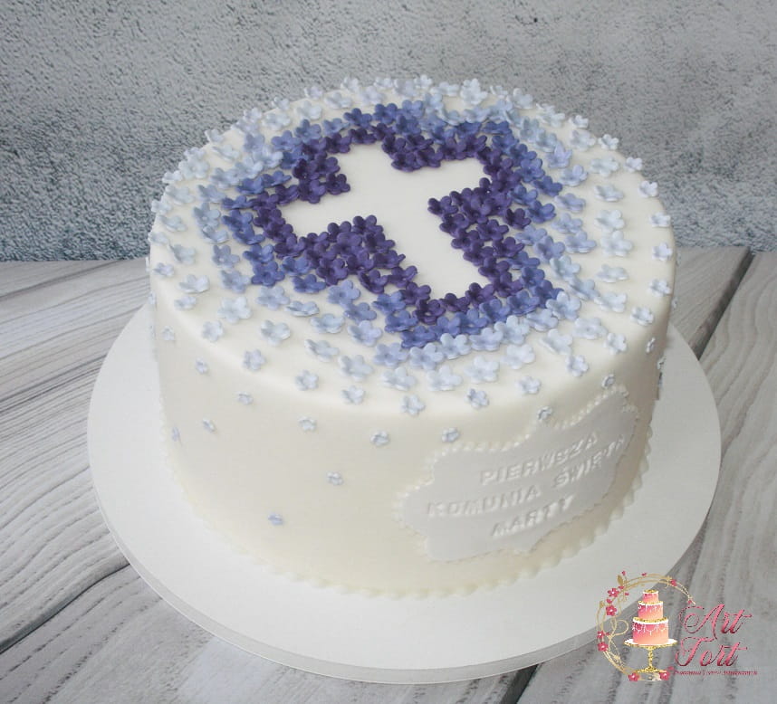 Tort komunijny z delikatną dekoracją małych kwiatków ułożonych w kształt krzyża w technice ombre. Możliwość innej kolorystyki kwiatków po uzgodnieniu. Powyżej 30 porcji tort będzie się składał z dwóch pięter. Górne piętro z kwiatkami jak na zdjęciu, dolne gładkie-białe z kilkoma kwiatkami w najjaśniejszym kolorze. Napis jest zawsze taki sam, zmienia się tylko imię dziecka.