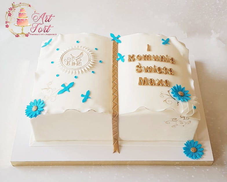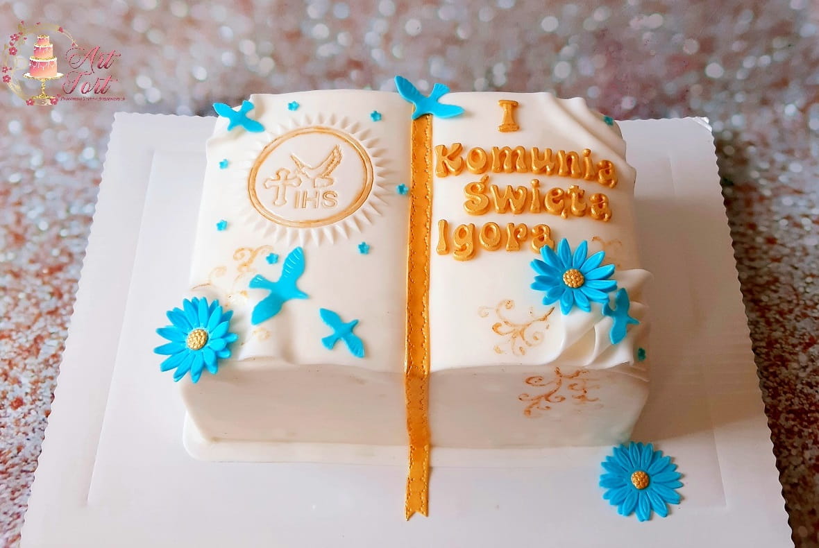 Tort komunijny w kształcie otwartej książki, pokryty masą cukrową, ozdoby i litery z masy cukrowej, niektóre malowane na złoto. Napis jest zawsze taki sam, zmienia się tylko imię dziecka.