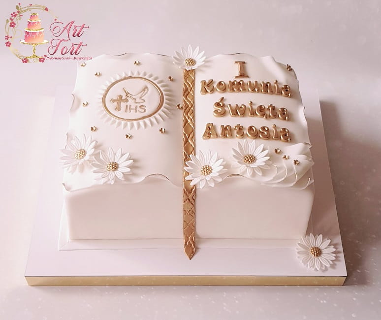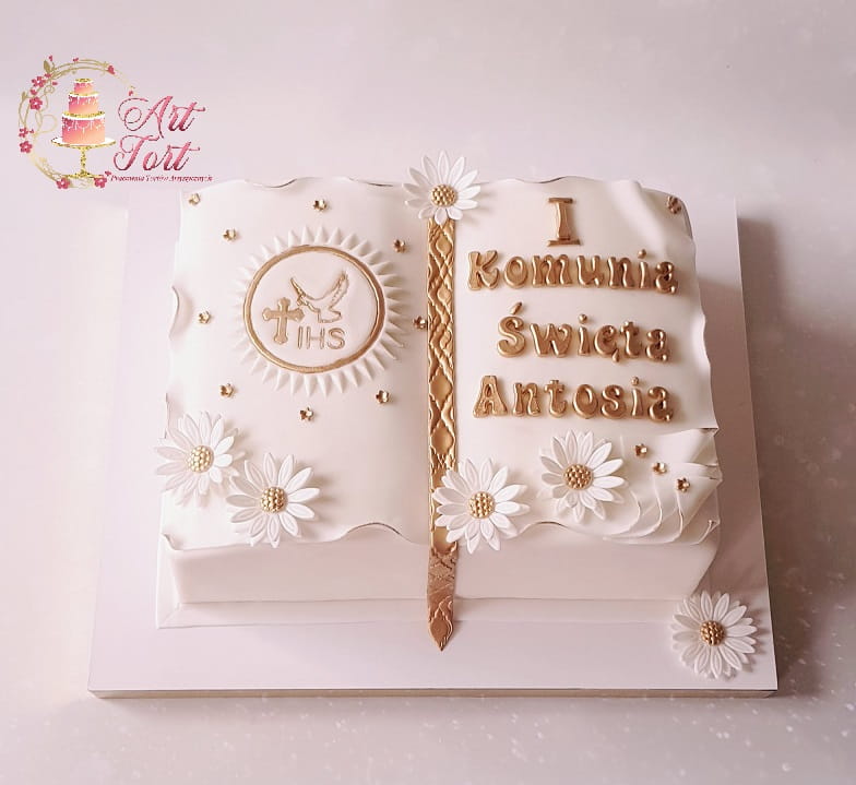 Pierwsza Komunia Święta to wyjątkowy moment, który zasługuje na oprawę pełną symboliki i elegancji. Nasz tort w kształcie otwartej księgi to słodki sposób na uczczenie tego sakramentu, łączący tradycyjną formę z nowoczesnym, luksusowym wykończeniem.