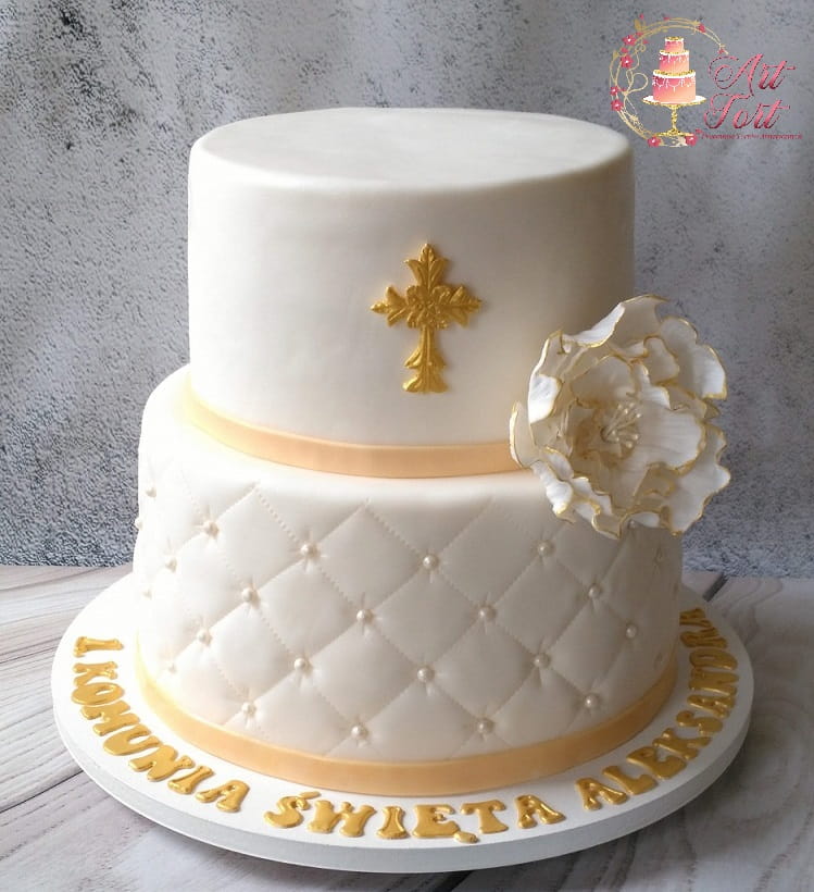Pikowany tort piętrowy dla minimum 25 osób, wykończony masą cukrową. Elementy dekoracyjne-kwiat ręcznie wykonany, również z masy cukrowej. Pikowanie wykończone cukrowymi, perełkami. Perełki mogą być dla niektórych twarde. Napis jest zawsze taki sam, zmienia się tylko imię dziecka.