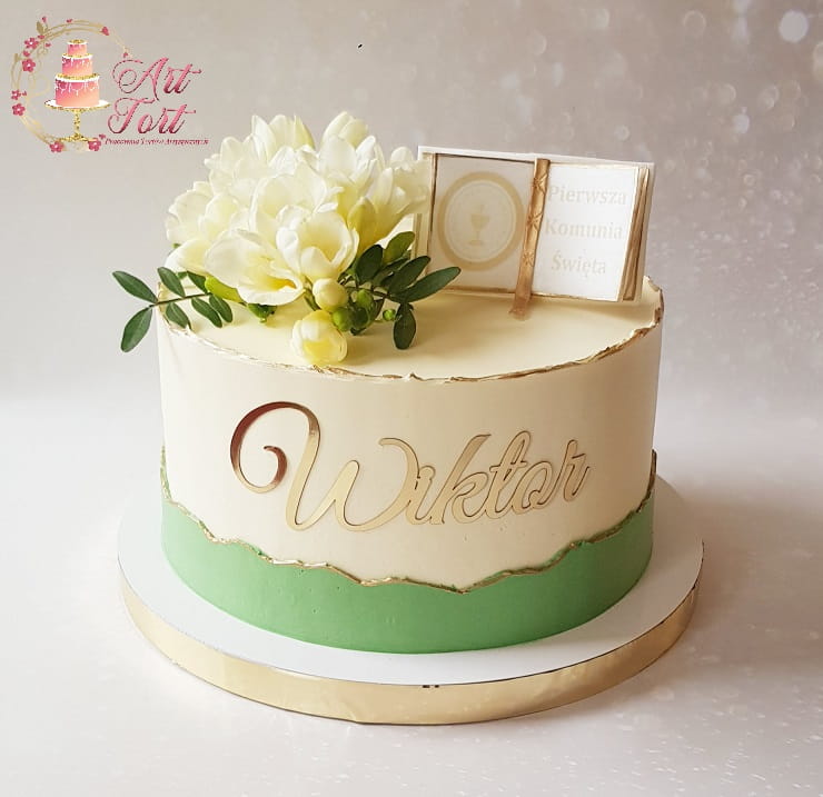 Tort komunijny z książeczką i białymi kwiatami (frezje, eustomy, róże), które będą aktualnie dostępne lub po wcześniejszym ustaleniu. Kolory biel (kremowa), zieleń i trochę złota. Możliwość zmiany koloru zielonego na inny po uzgodnieniu. Złoty, błyszczący napis-imię jest na zamówienie i możliwy przy złożeniu zamówienia i opłaceniu z przynajmniej tygodniowym wyprzedzeniem w innym wypadku będzie zrobiony z literek z masy cukrowej. Na książeczce jest zawsze napis "Pierwsza Komunia Święta", proszę podać tylko imię dziecka. Tort wykończony jest kremem maślanym.