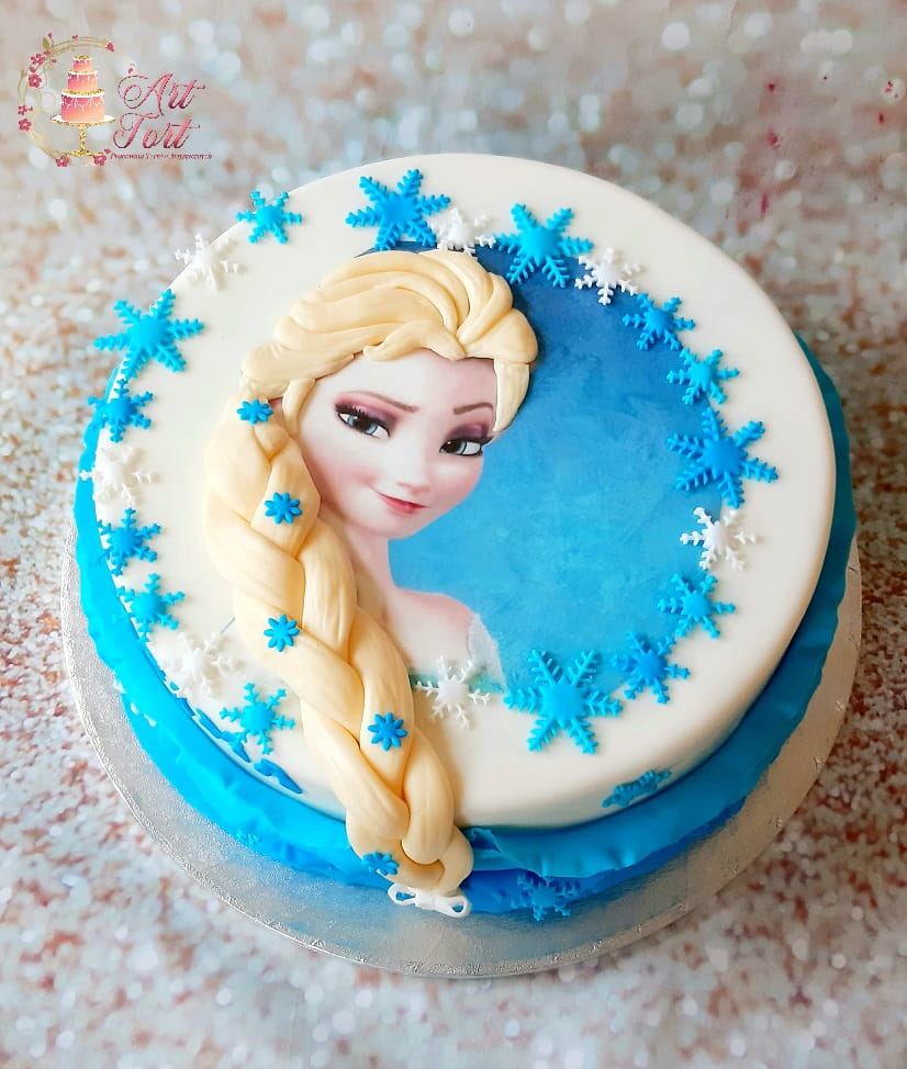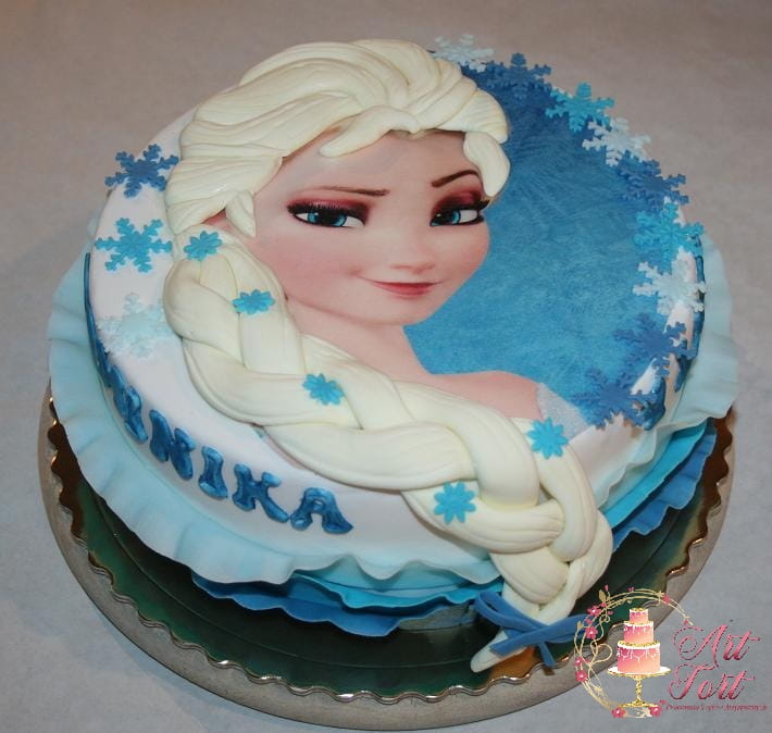 Tort z wizerunkiem Elzy z Krainy Lodu, włosy 3D wykonane z masy cukrowej. Tort wykończony masą cukrową.