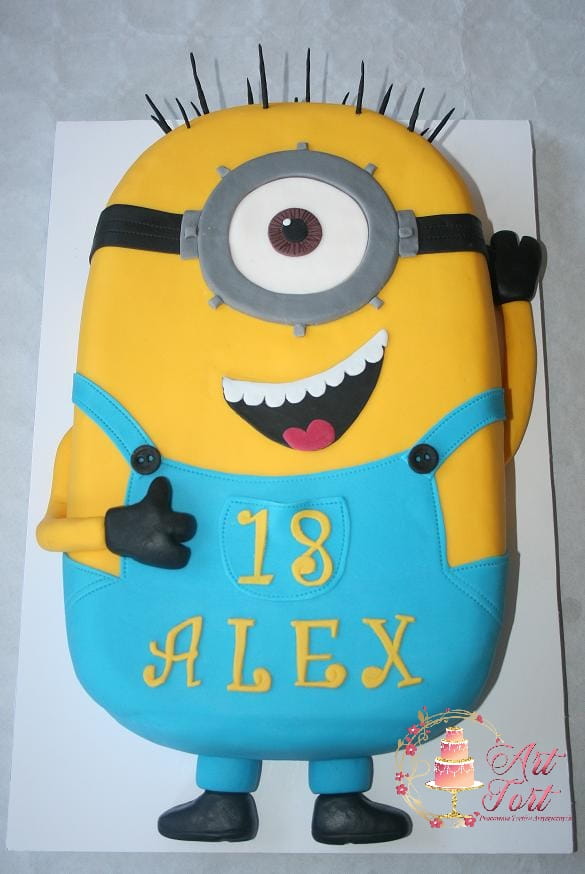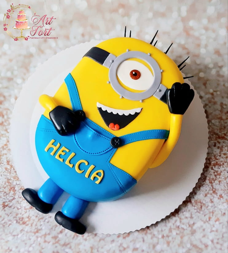 Tort w kształcie figurki Minionka, wykończony masą cukrową.