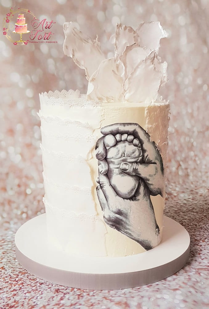 Tort na chrzest, piętrowy z tzw. ukrytym piętrem, wysoki aby grafika ładnie się prezentowała. Dekorowany artystycznie powycinanymi paskami z papieru opłatkowego.