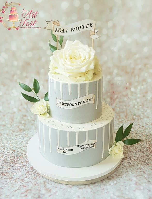 Tort piętrowy, szary ze spływającą białą, czekoladową polewą, ozdobiony białymi różami z zielonym akcentem. Istnieje możliwość zmiany koloru po uzgodnieniu mailowym.
