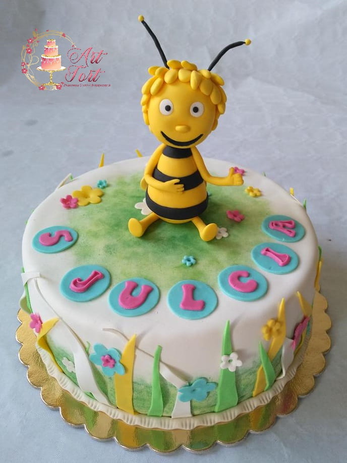 Tort z ręcznie wykonaną figurką Pszczółki Mai. Całość wykończona masą cukrową.
