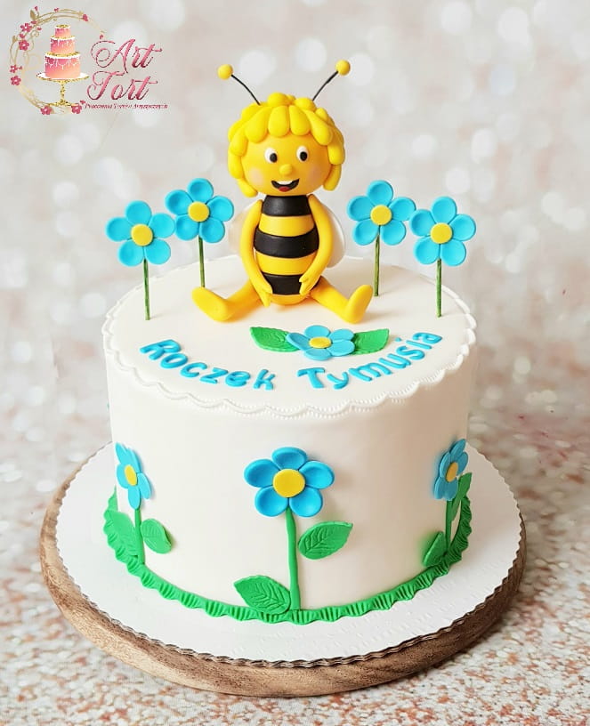 Tort z ręcznie wykonaną figurką Pszczółki Mai. Całość wykończona masą cukrową.