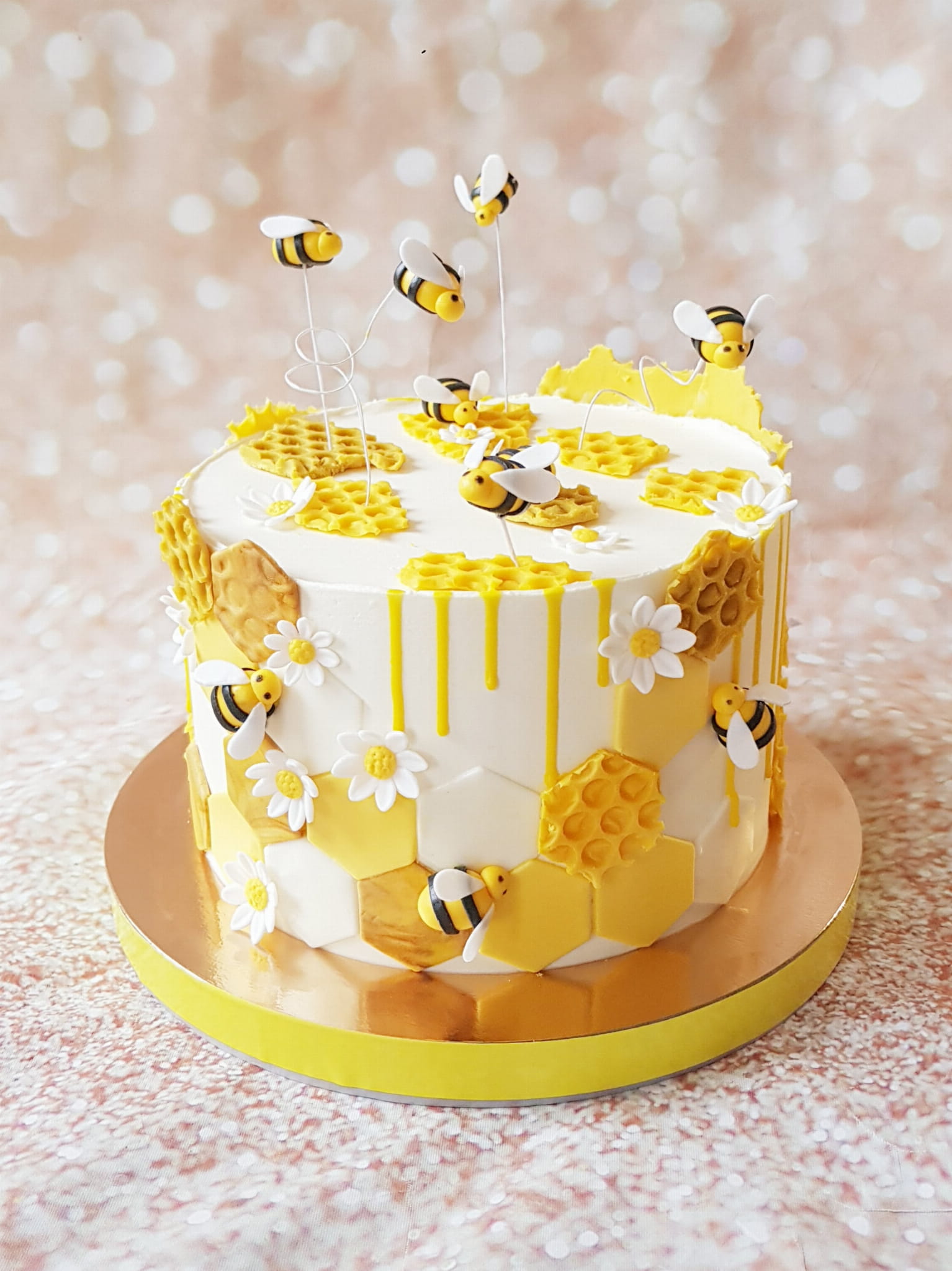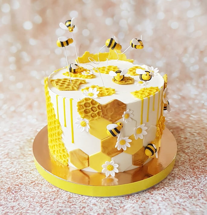 • Geometryczna Precyzja: Dolną część tortu zdobią heksagonalne kafle w odcieniach żółci, nawiązujące do struktury prawdziwego ula.