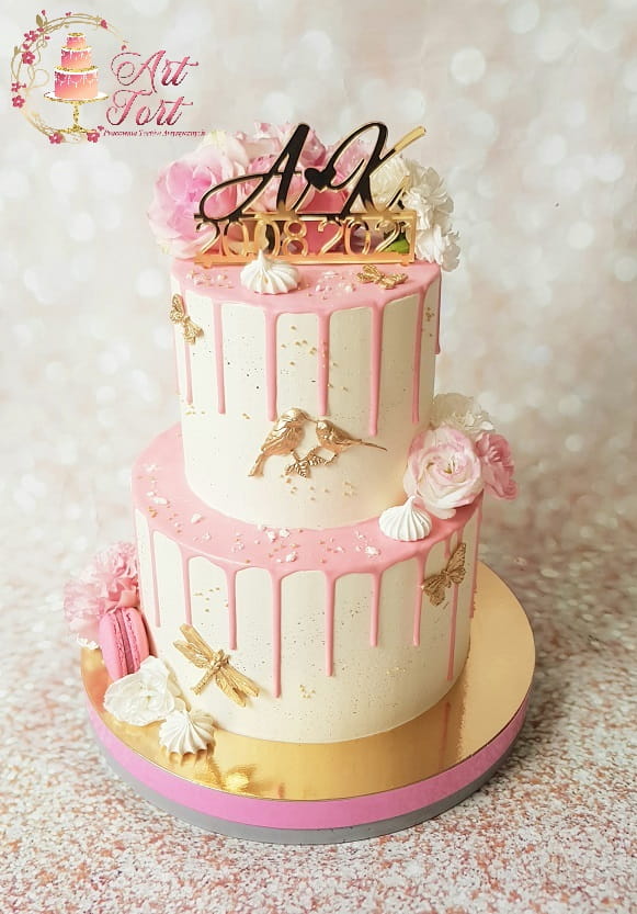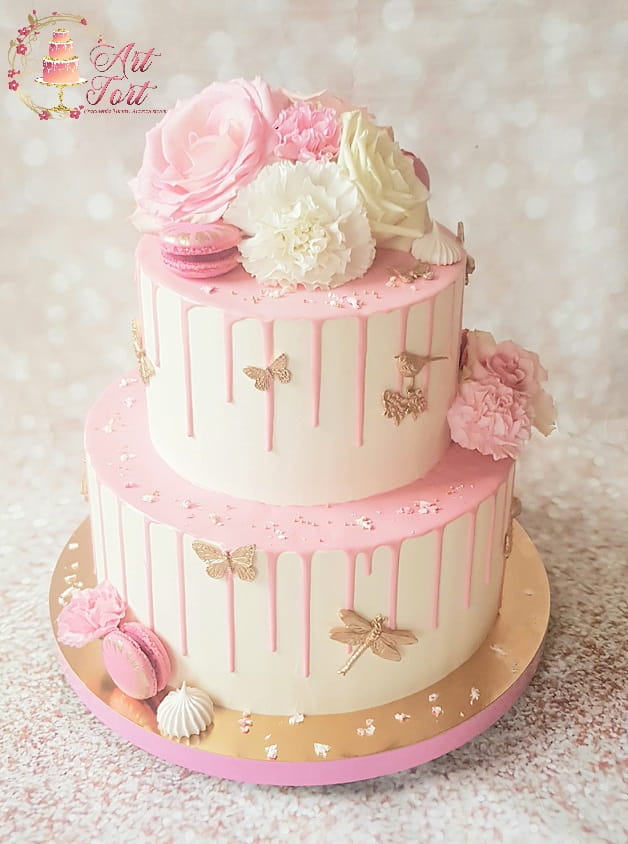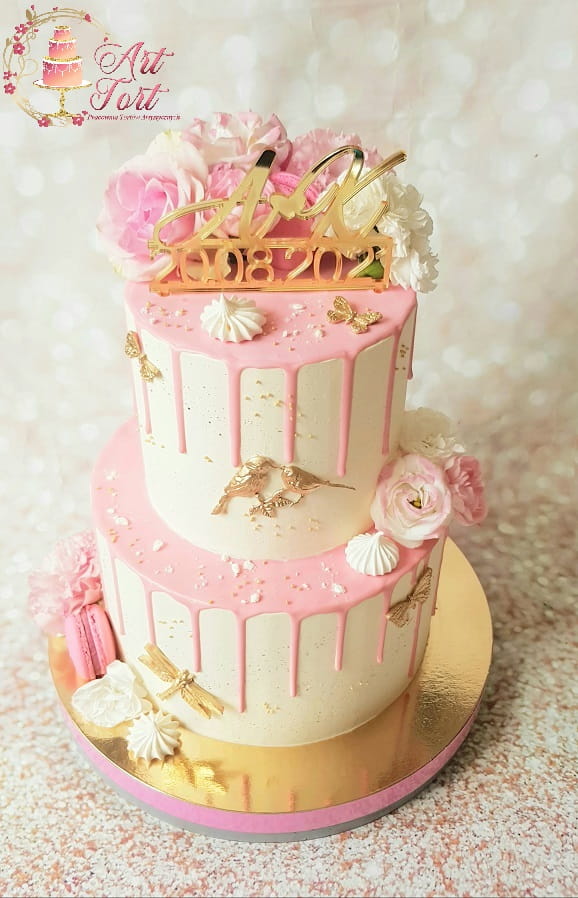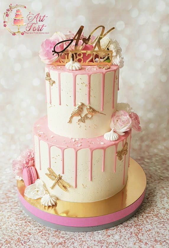 Piętrowy tort z różową, czekoladową polewą, z kwiatami, makaronikami i złotymi dodatkami:motylki, ważki, ptaszki, wykończony kremem maślanym. Bez napisu-złoty topper zamawiany osobno wg życzenia, dodatkowo płatny. Dekorację wg życzenia można trochę zmodyfikować,po uzgodnieniu.