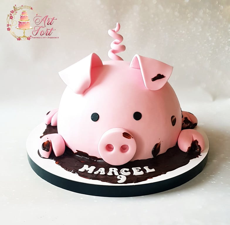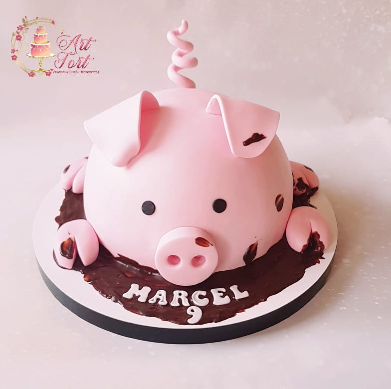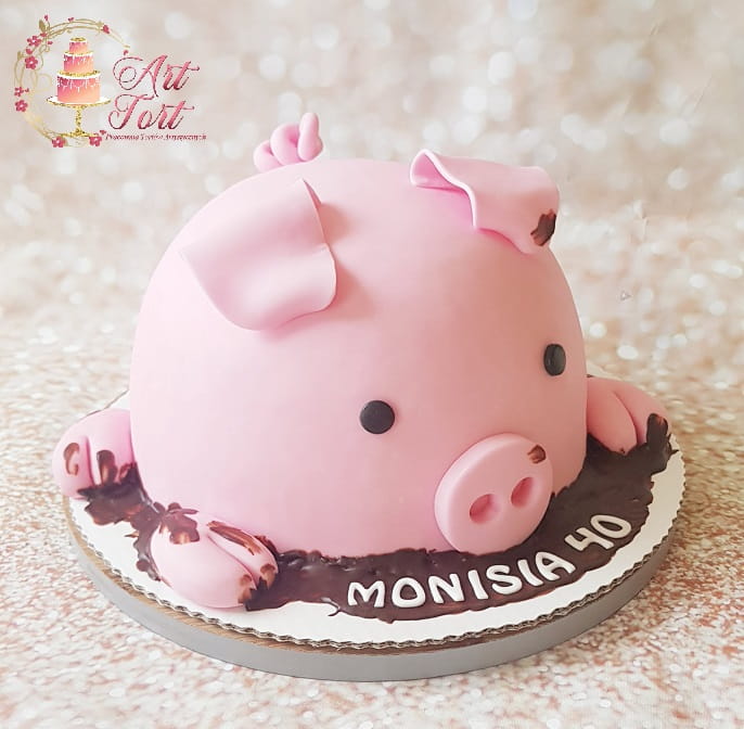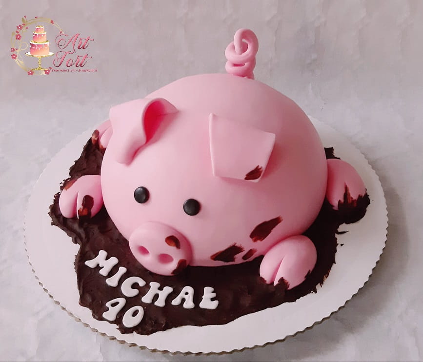 Tort w kształcie świnki w błocie z czekolady. Wykończony masą cukrową.