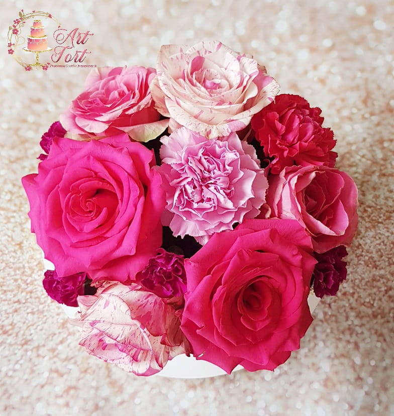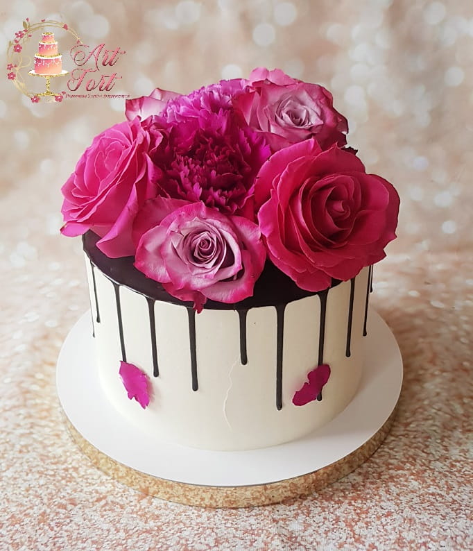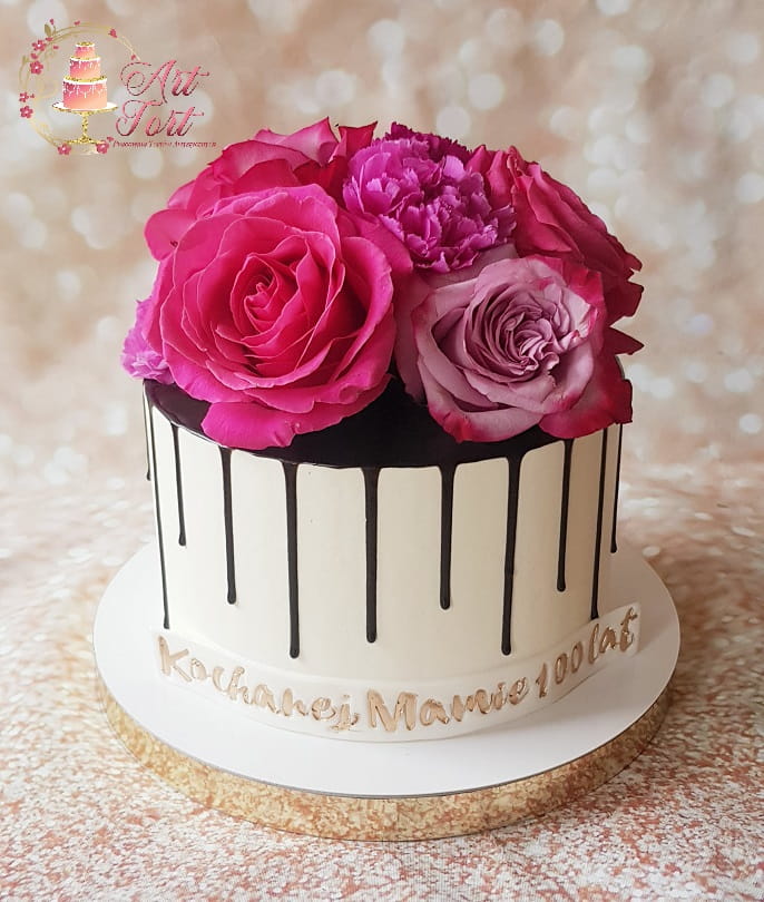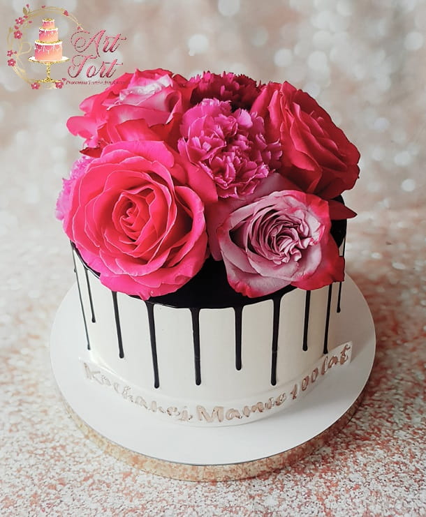 Tort z kwiatami w kolorach ciemnego i jasnego różu, ozdobiony spływającą ciemną czekoladą. Ilość kwiatów dopasowywana jest do wielkości tortu. Możliwość zmiany kolorów kwiatów po uzgodnieniu. Powyżej 25 porcji wykonujemy w dwóch piętrach.