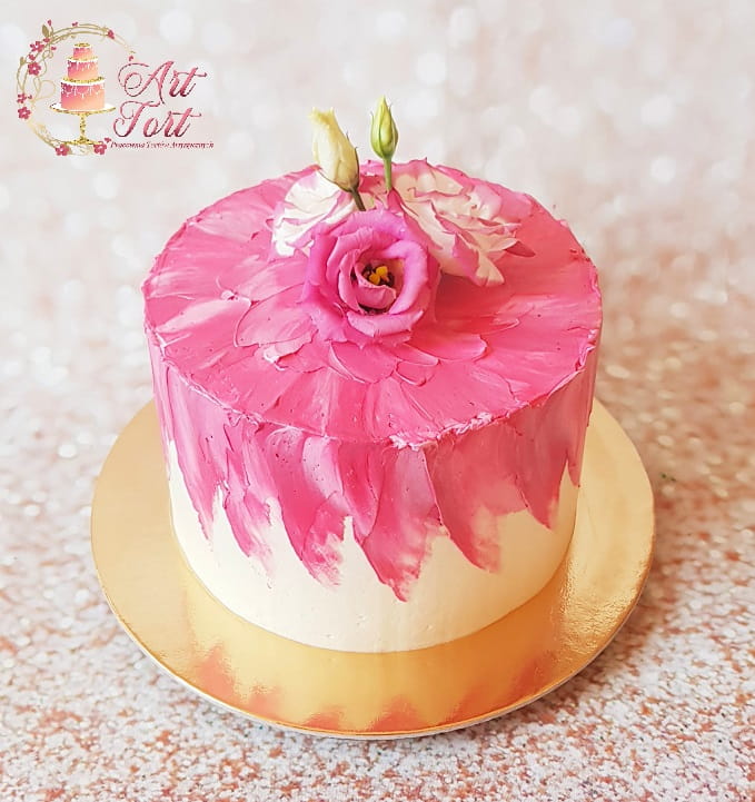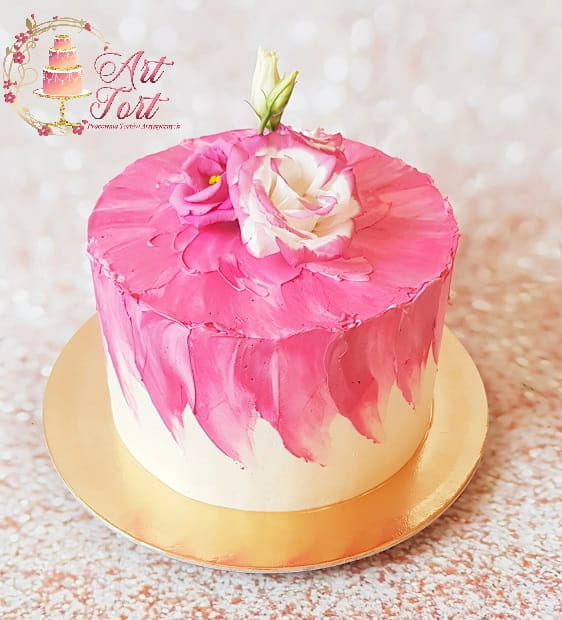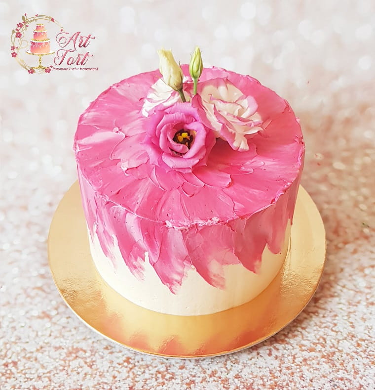 Tort malowany kremem z dekoracją z kwiatów (eustomy).