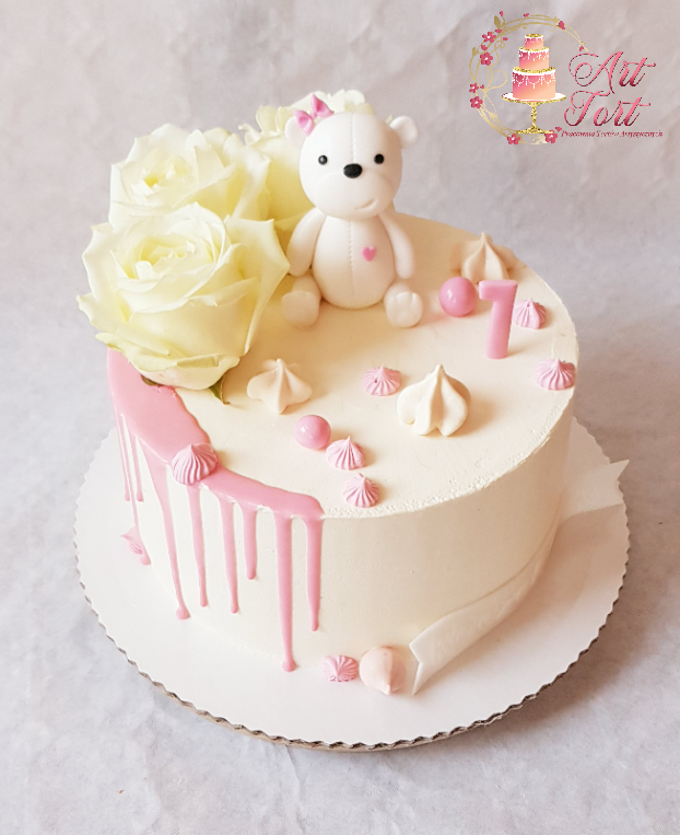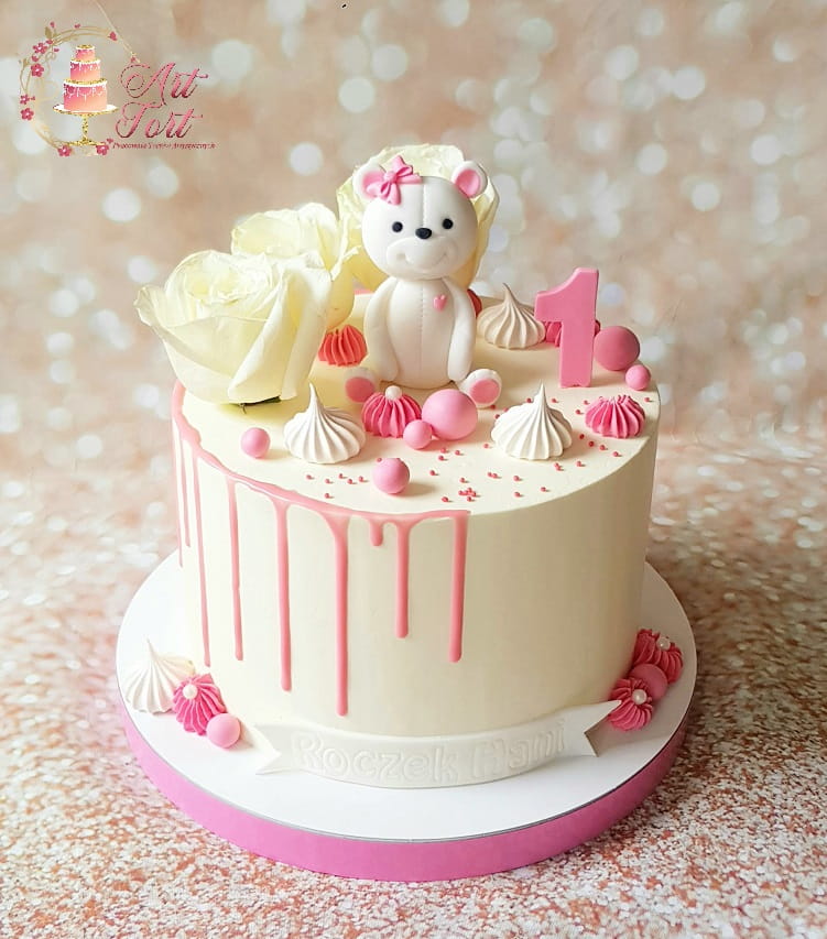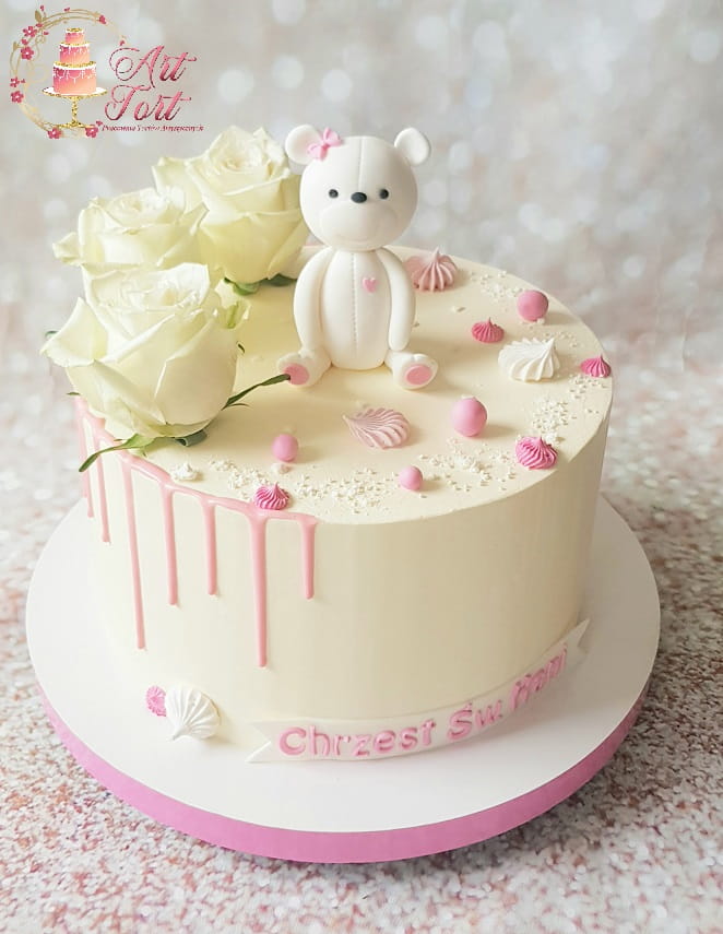 Elegancki tort dla dziecka na urodziny lub na chrzest wykonany w kremie maślanym z cukrowym misiem, żywymi różami, w kolorach różu, bieli/ ecru oraz spływającą kolorową polewą z czekolady.