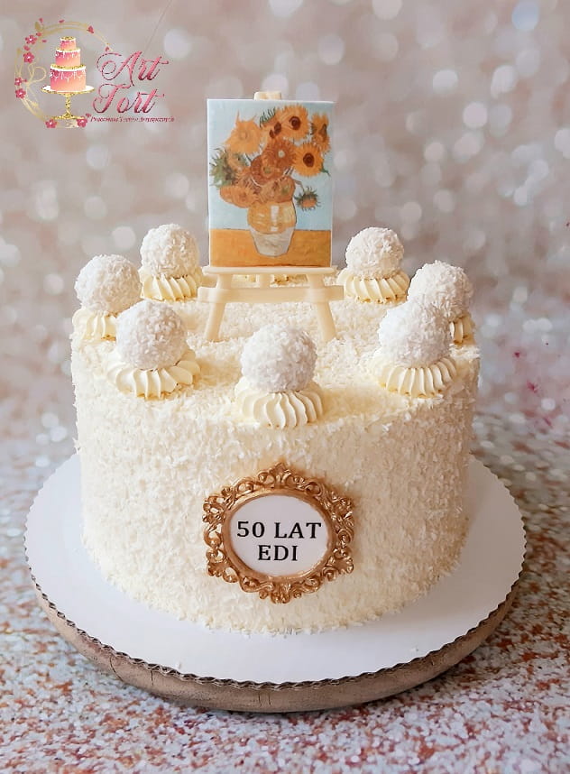 Tort z dekoracją w postaci sztalugi i obrazu ze słonecznikami Van Gogha-można wysłać w uwagach swój pomysł na obraz. Posypany wiórkami kokosowymi i udekorowany czekoladkami Raffaello.