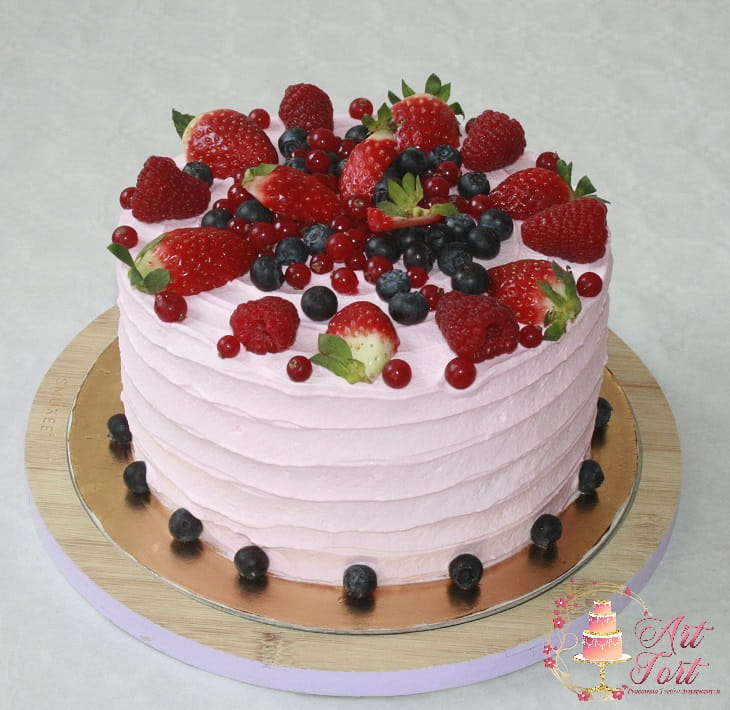 Tort okolicznościowy, wykończony kremem, tu w kolorze różowym, możliwy inny kolor lub bez (biały). Na wierzchu owoce sezonowe. Od 30 porcji wykonywany w dwóch pietrach.