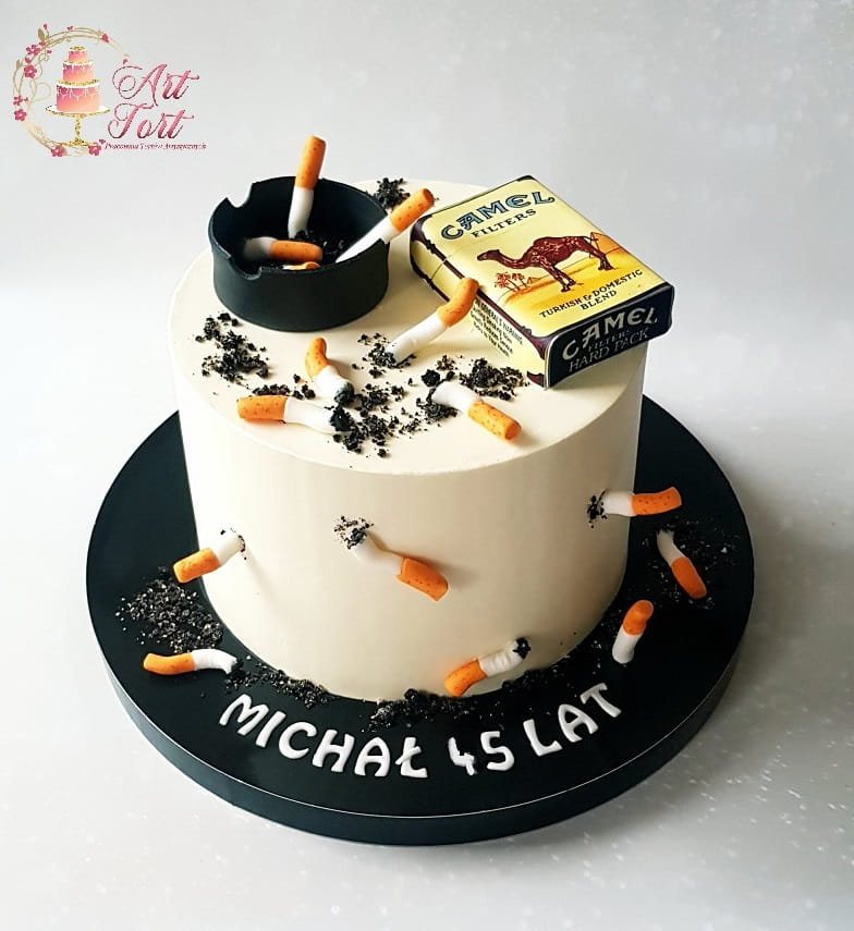 - Realistyczne dekoracje cukrowe: Na szczycie tortu znajduje się precyzyjnie wykonana, jadalna paczka papierosów oraz popielniczka wypełniona niedopałkami.